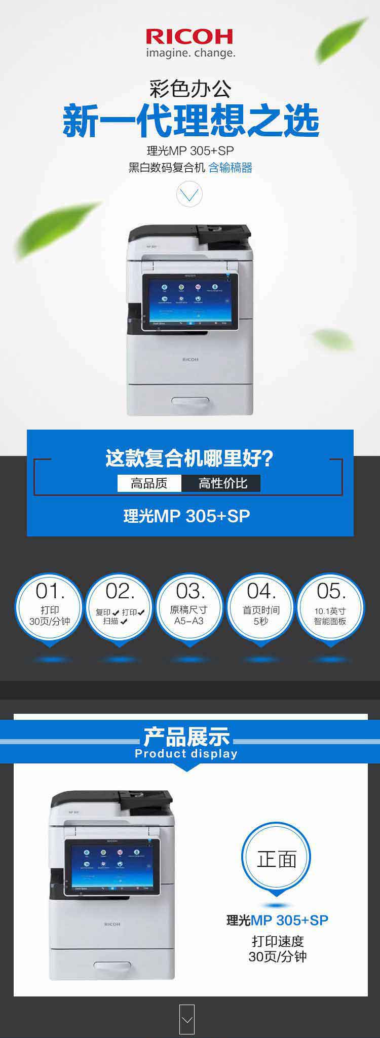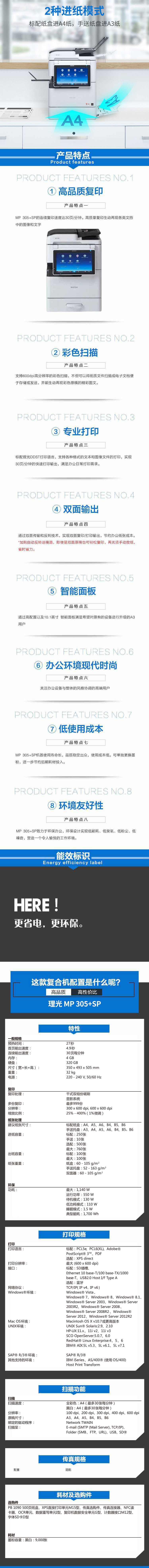 理光(Ricoh)MP 305+SP A3黑白多功能复印机 (主机+自动输稿器+安全文印系统)