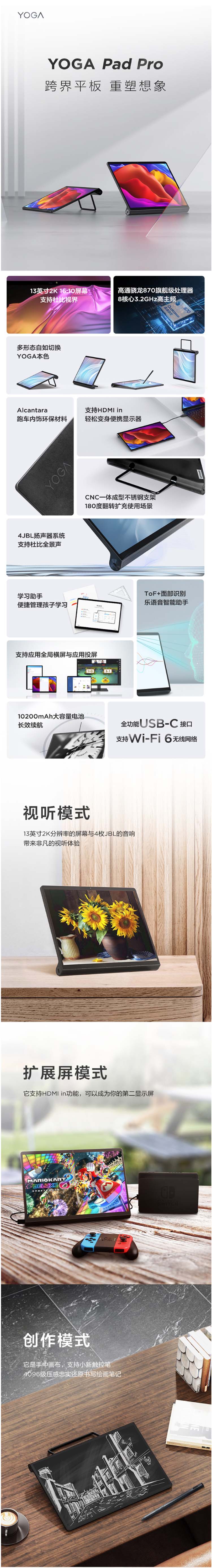 联想(Lenovo)Yoga pad pro 平板式微型计算机 高通骁龙662 13英寸 平板电脑 10000mAh大电池 2k全面屏 8GB+256GB 玄青黑