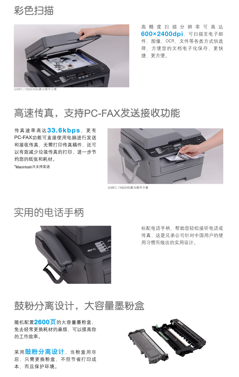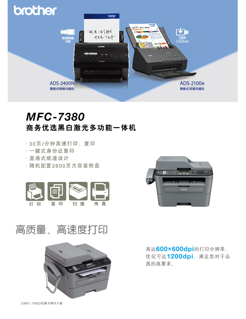 兄弟(brother)MFC-7380 黑白激光多功能一体机 打印、复印、扫描、传真