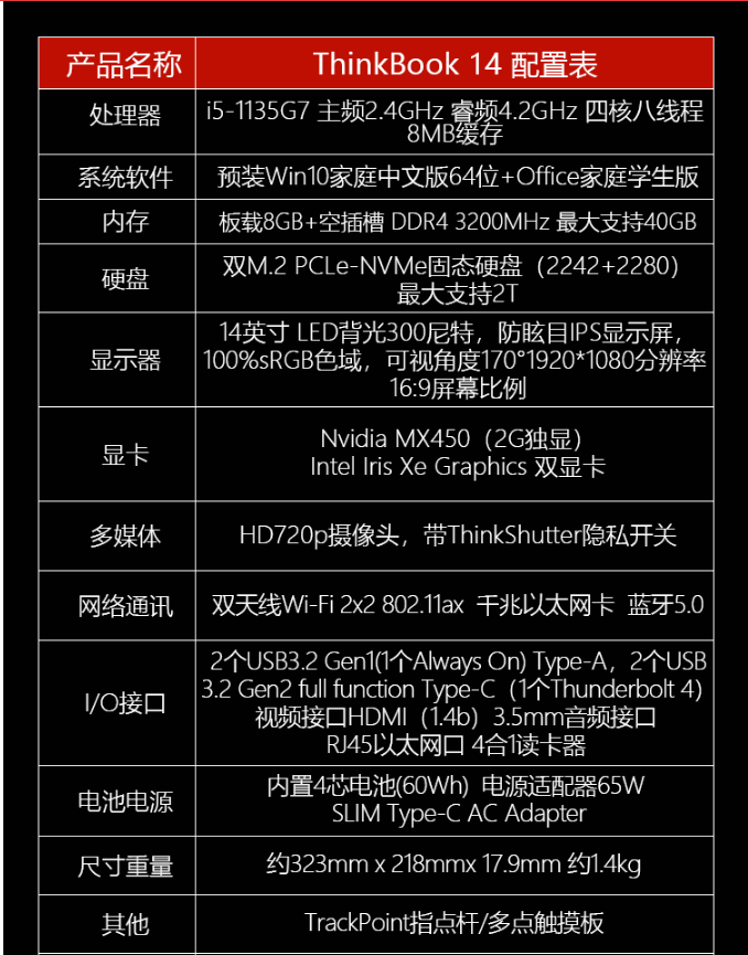 联想笔记本ThinkBook 14(05CD)便携式计算机 14英寸 i5-1135G7 8G内存 512G固态 2G