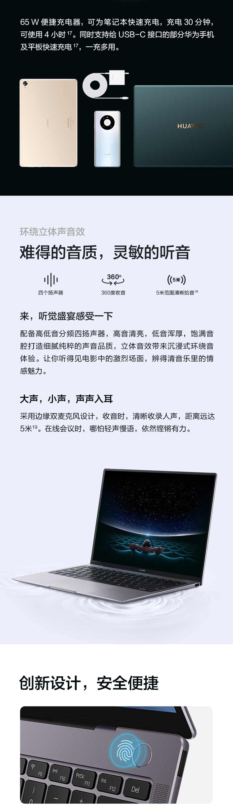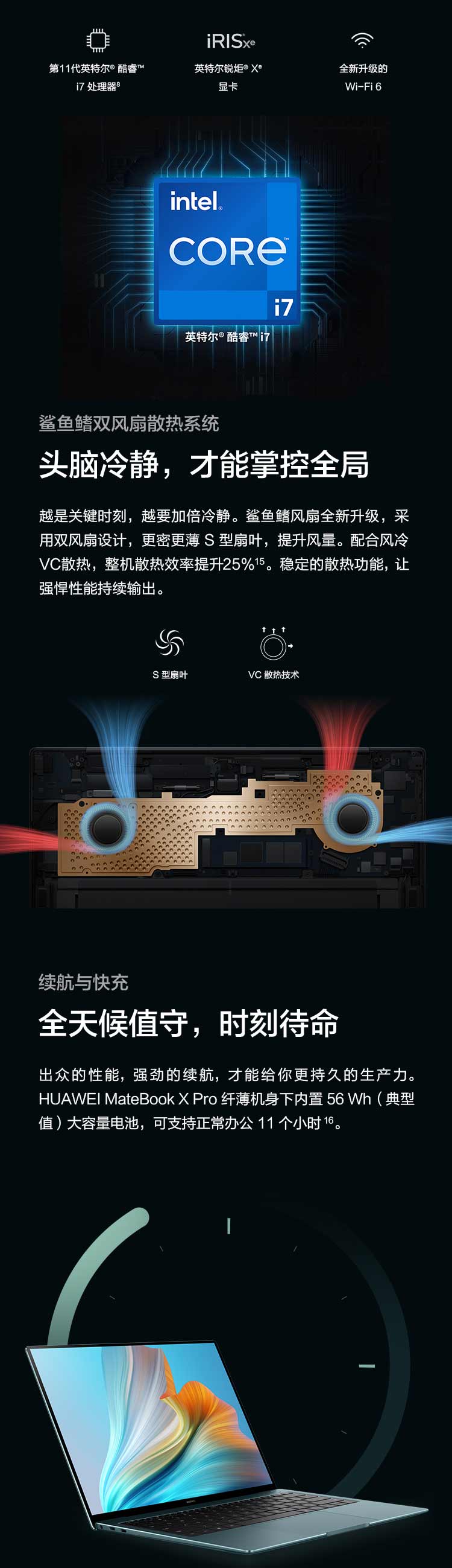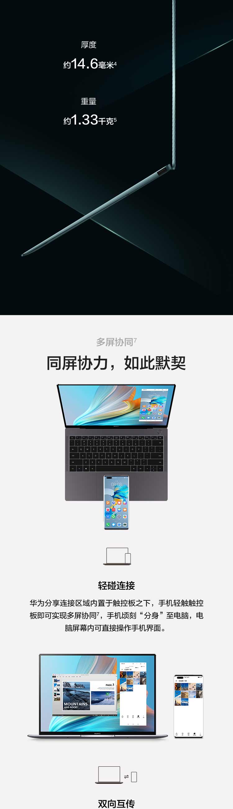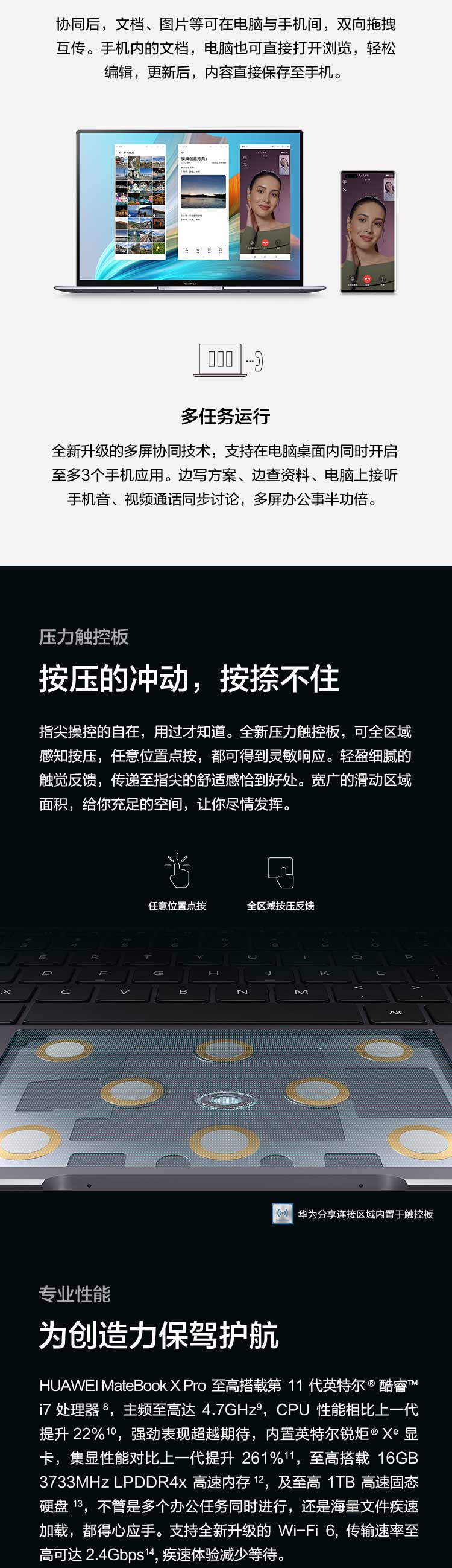 华为 MateBook X Pro 2021 便携式计算机 笔记本电脑款13.9英寸11代酷睿i7 16G 512G 锐炬显卡/3K触控全面屏/多屏协同 翡冷翠