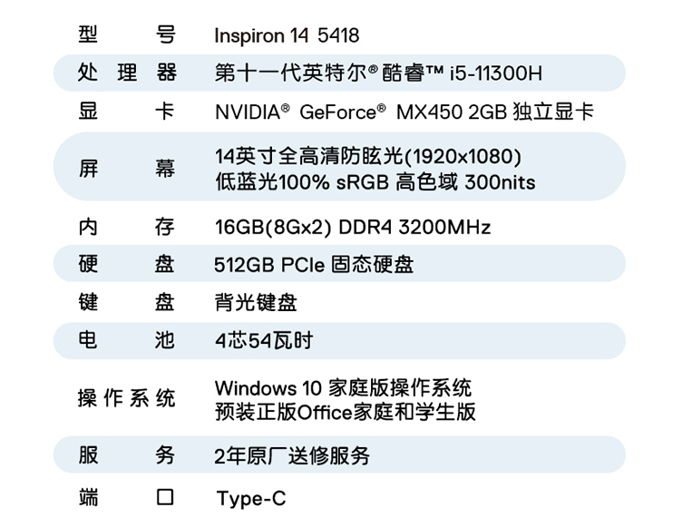 戴尔DELL灵越14Pro-5418 14英寸高色域防蓝光轻薄商务笔记本电脑(标压i5-11300H 16G 512G MX450 100%sRGB)银