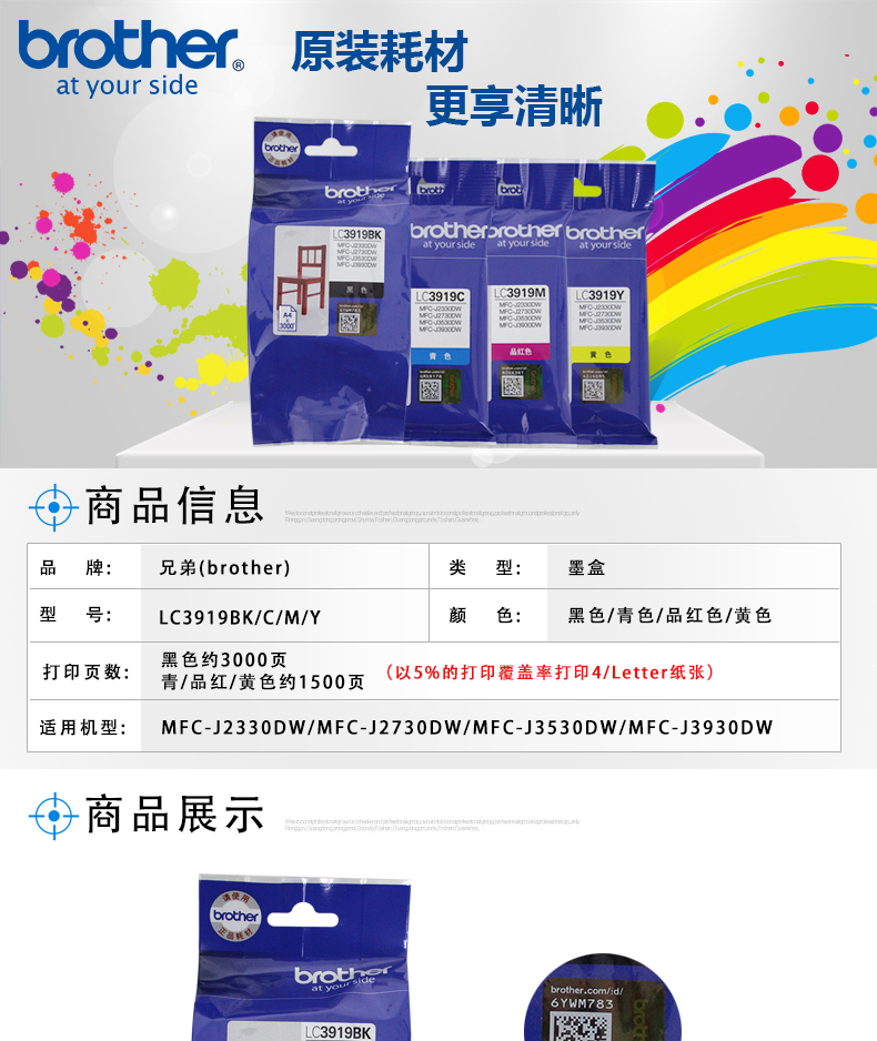 原装兄弟LC3919BK黑色彩色墨盒 MFC-J3930DW 3530DW 2330 2730 LC3919BK黑色墨盒 3000页/A4纸5%