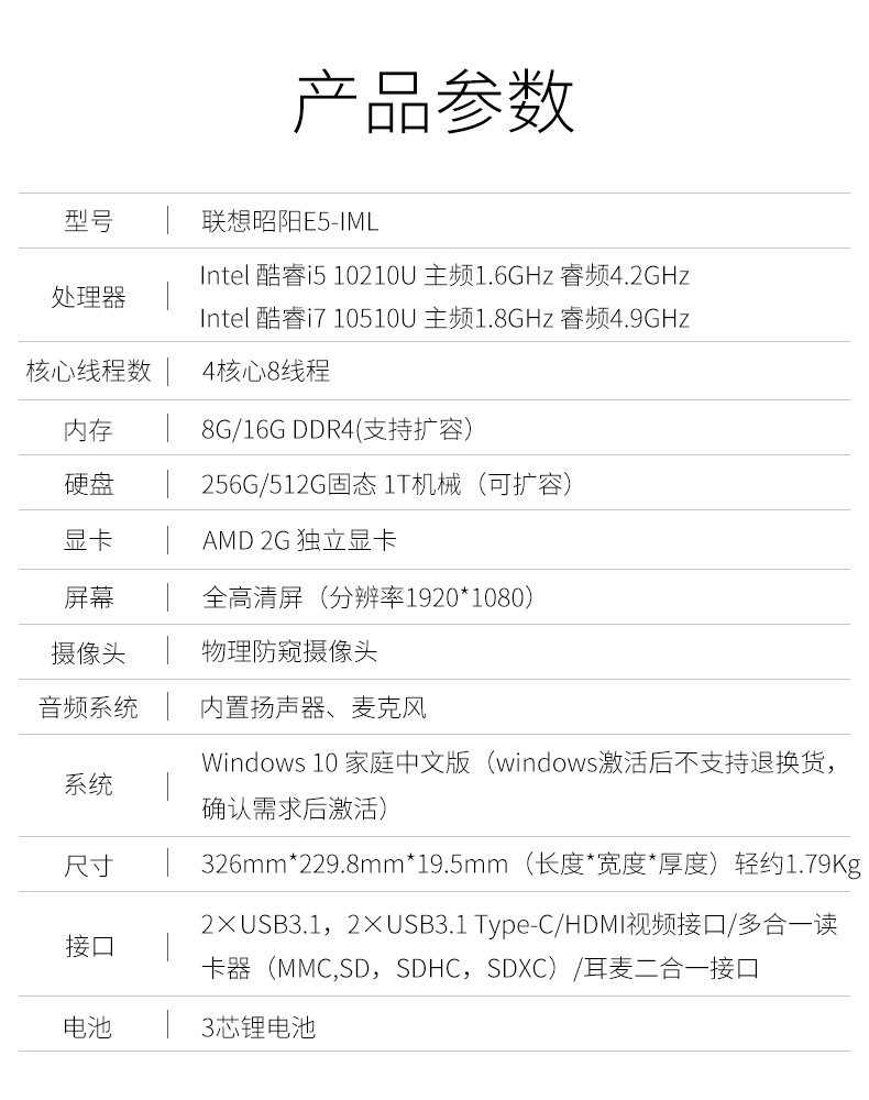 联想(Lenovo)昭阳E5-IML 15.6英寸2020款十代i5/i7商务设计轻薄游戏笔记本电脑 i5-10210 2G独显 全高清屏 8G内存 512G固态硬盘 定制