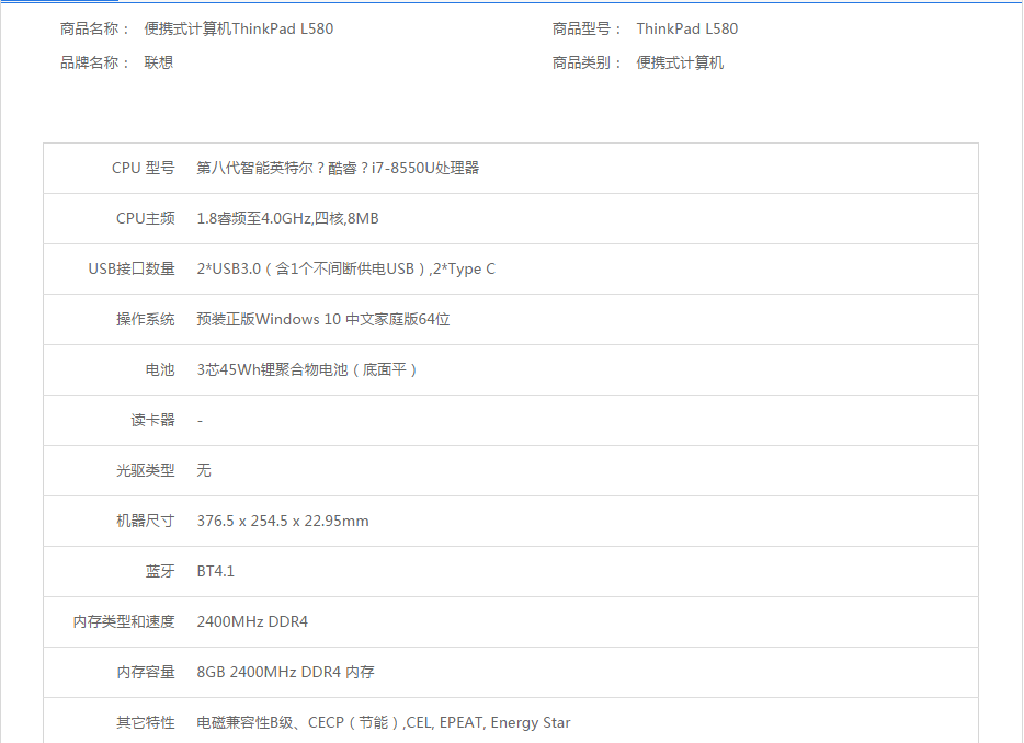 联想 便携式计算机ThinkPad L580