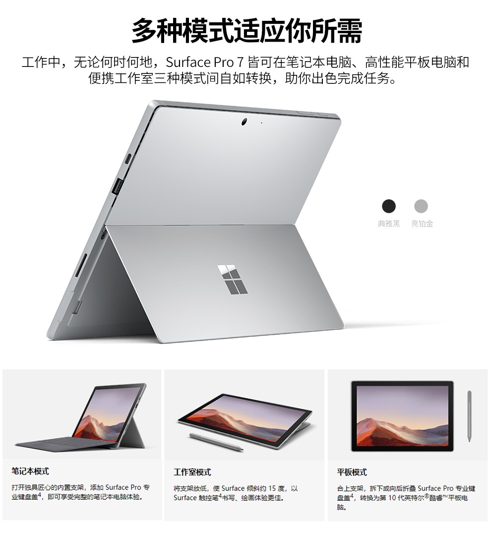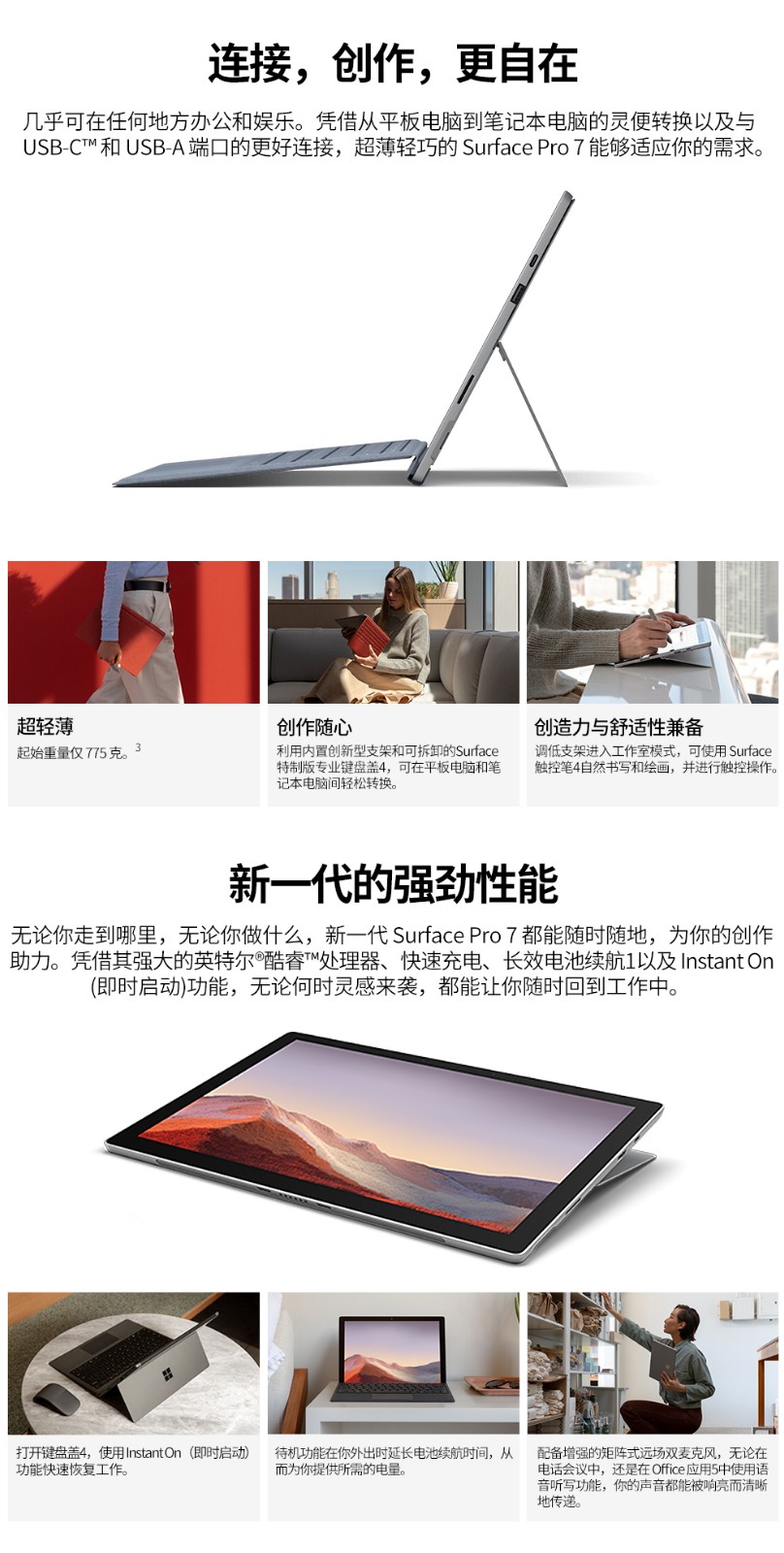 微软 Surface Pro7 便携式计算机 二合一平板电脑笔记本 12.3英寸 i5 8+128G亮铂金