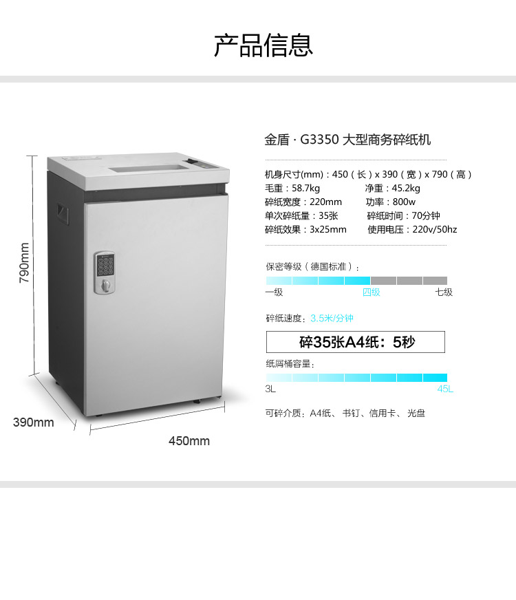 科密/Comet G-3350 碎纸机 4级保密 45L大容量 光盘粉碎机