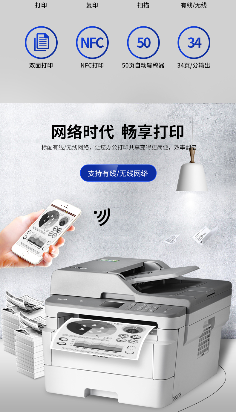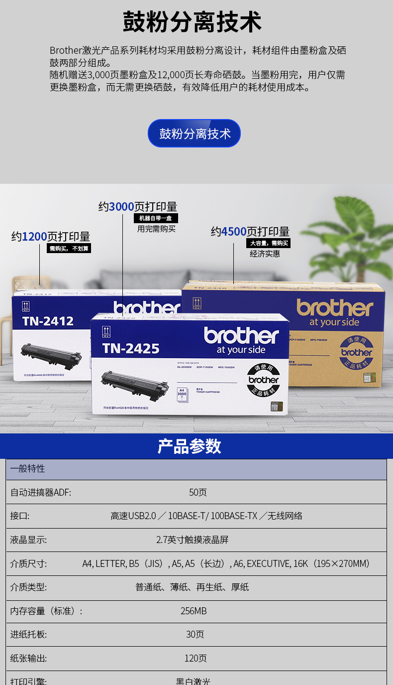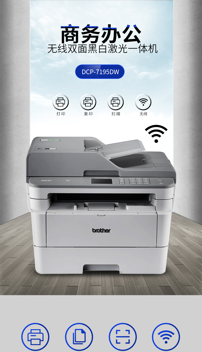 兄弟(brother)DCP-7195DW 黑白激光多功能一体机打印复印扫描双面无线网络家用办公 DCP-7195DW标配(三合一)