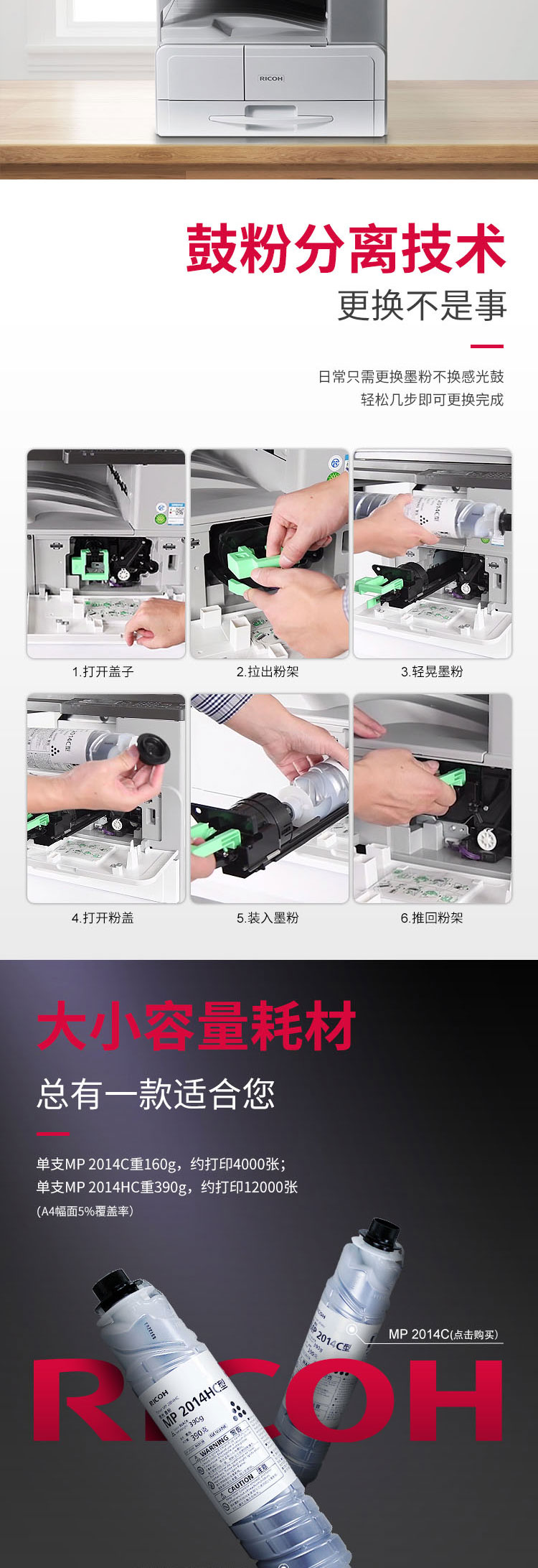 理光(Ricoh)MP 2014 A3黑白数码复合机 标配含盖板(免费上门安装+1年保修)